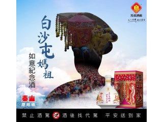 泰山攜手馬祖酒廠首推「白沙屯媽祖如意紀念酒」全台限量2,880瓶!最有個性的「媽祖」-苗栗通霄拱天宮白沙屯媽祖繞境活動於3月18日盛大登場!每年吸引眾多信徒追隨,今年更將突破超過16萬人朝聖。 馬祖酒廠、泰山企業首度攜手與白沙屯拱天宮合作,推出「白沙屯媽祖如意紀念酒」限量酒款。