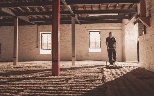 我們是為數不多的使用傳統地板麥芽法製造大麥麥芽的釀酒廠之一。當大麥被運送到大麥閣樓並儲存時,這個過程就開始了。需要時,將其浸泡在涼爽、乾淨的水中,放置三天以使其膨脹。然後將其放置在我們的麥芽地板上 6 英寸深的均勻層中,我們的團隊會定期轉動它。