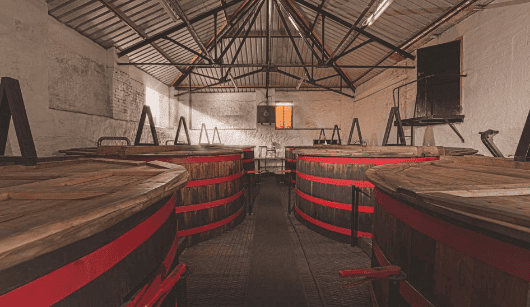 從糖化中排出的液體,稱為麥芽汁,被轉移到木製洗滌槽中,我們有六個,每個都由落葉松木皮製成。正是在這裡添加酵母,在長達 110 小時的發酵過程中將糖轉化為酒精——之後液體就可以進行蒸餾了。