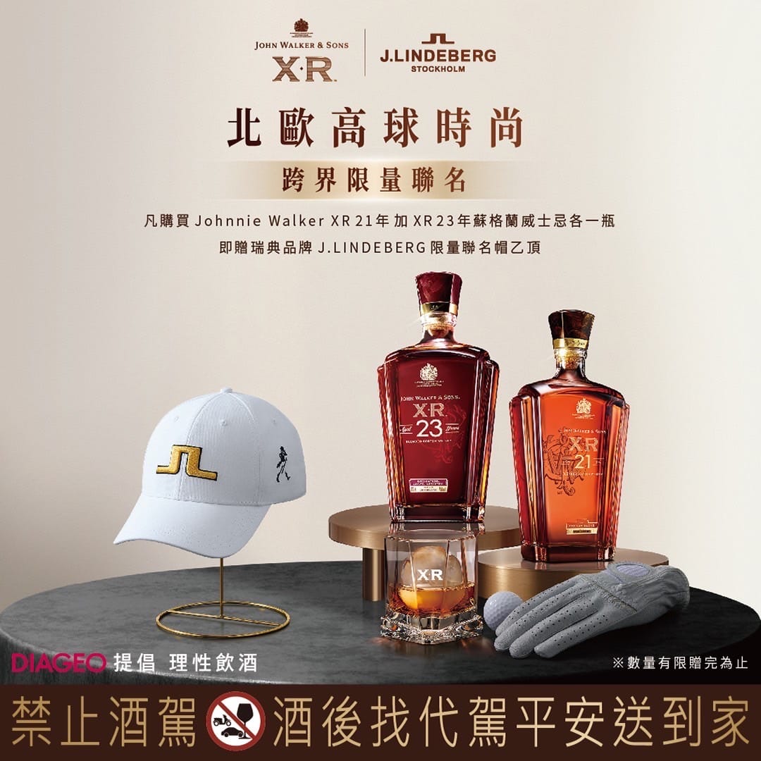 活動期間:11/15-12/31 活動辦法:消費者購買XR 21 + XR 23各一瓶,即贈送J.Lindberg 休閒帽乙頂。 ※數量有限 送完為止※ #約翰走路 XR 21年調和威士忌#Johnnie Walker XR#XR#21年#23年#約翰走路 XR 23年