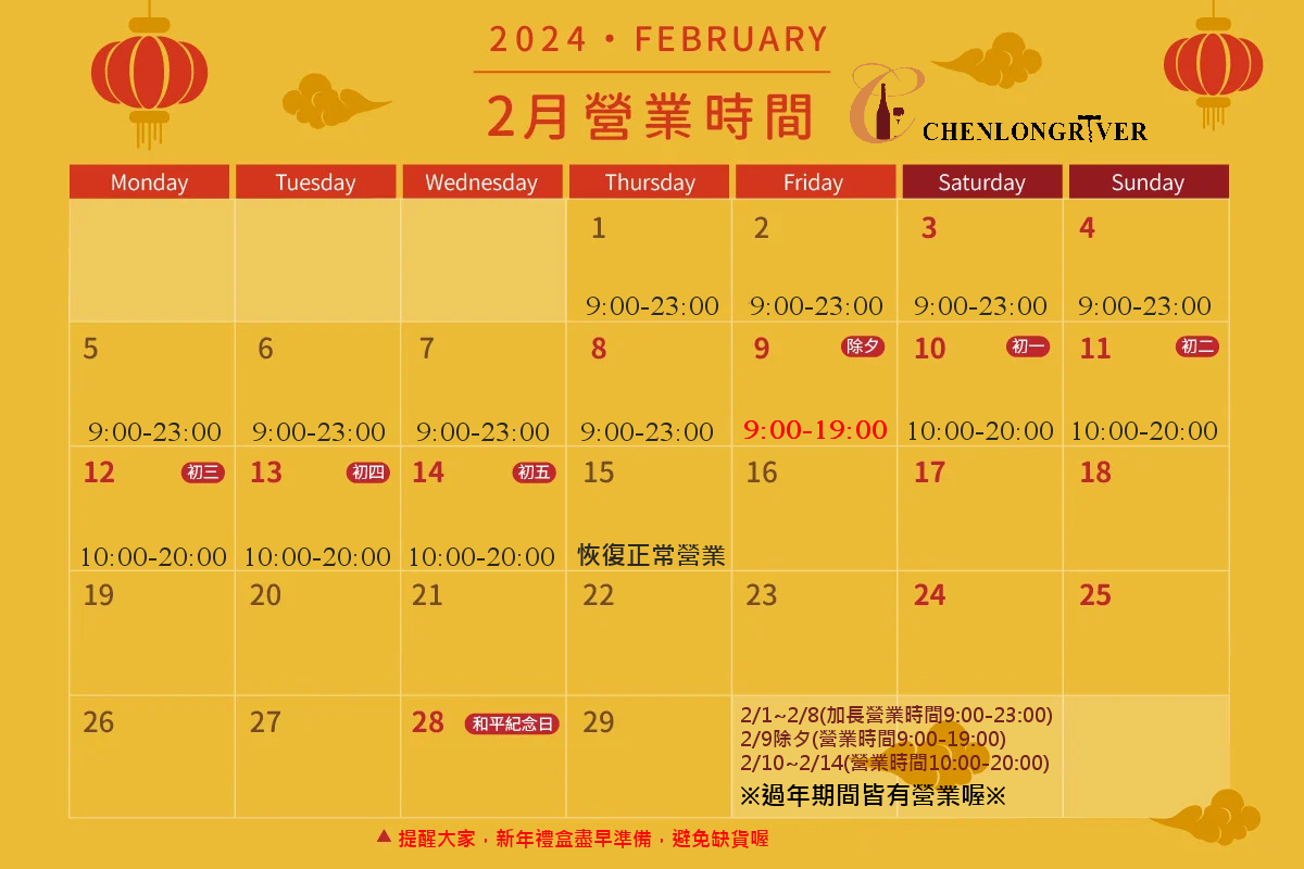 炮聲龍龍新年到~ 農曆春節金龍即將降臨 『營業時間公告』 2/1~2/8(加長營業時間9:00-23:00) 2/9除夕(營業時間9:00-19:00) 2/10~2/14(營業時間10:00-20:00) ※過年期間皆有營業喔※ 提醒大家,新年禮盒盡早準備,避免缺貨喔