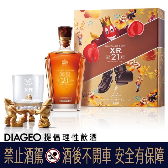 「跨界極選系列XR21禮盒」則附Johnnie Walker X Philip Colbert龍蝦先生醇金品酩組之威士忌杯及杯架,晶透的高級威士忌杯,杯身印上Philip Colbert獨家標誌,杯底的精緻雕刻更是細節到位;龍蝦造型杯架以三位龍蝦先生相互圍繞形成底座,滿溢著趣味巧思,完美兼具精緻外觀與實用性,送禮自用兩相宜。