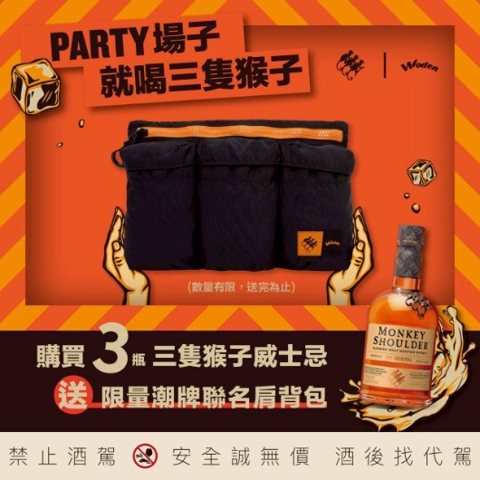 指定菸酒專賣店贈獨家潮包,隨性穿搭鬆弛感拉滿Monkey Shoulder X WODEN®聯名系列於三大實體通路推出專屬優惠,讓消費者能在日常購買中輕鬆入手限量單品。自6月20日起,凡於全台指定菸酒專賣店,購買3瓶三隻猴子威士忌,即可獲得Monkey Shoulder X WODEN®潮牌聯名肩背包乙個。