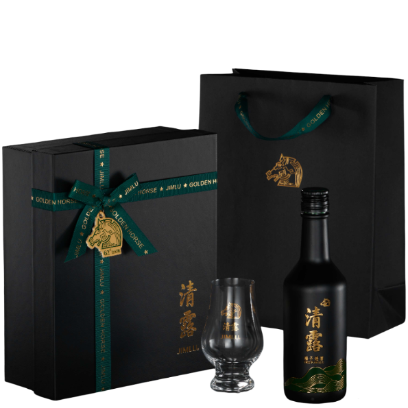 霧黑瓶身描繪山巒與雲霧意象 蘊藏典藏氛圍,黑綠配色點綴金馬圖騰 低調極具質感,搭配專屬金馬圖騰酒杯 舉杯共賞榮耀時刻,附金馬聯名酒杯/紙袋一只