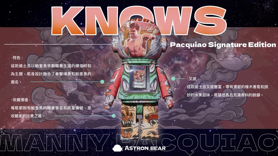 天文熊與著名拳擊冠軍曼尼·帕奎奧 (Manny Pacquiao) 聯名推出的系列產品, 是品牌的一大亮點。這一系列將帕奎奧的堅毅精神與天文熊的品牌理念完美結 合,打造出兼具收藏價值和紀念意義的獨特威士忌。 每瓶都附有帕奎奧的親筆簽名和限量編號,是收藏家的珍貴之選。
