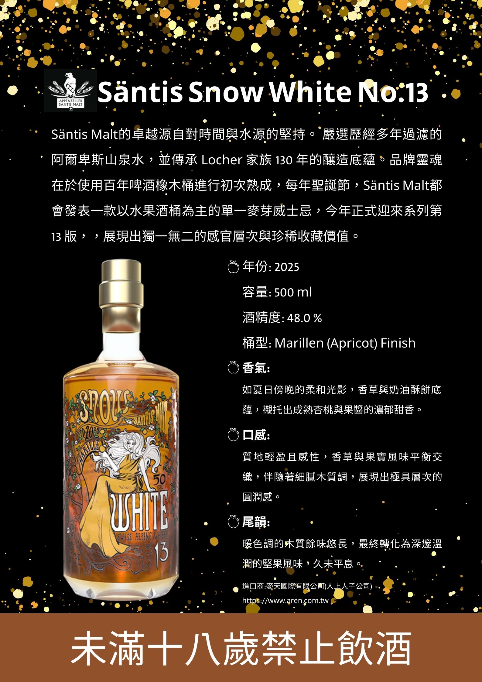 期待已久的 Säntis Malt 白雪公主系列迎來最新第十三代,延續品牌極具辨識度的老啤酒桶風格,再以杏桃甜酒桶作最終熟成,讓酒體在經典麥芽厚度之外,疊加更鮮明的果醬甜香與圓潤層次。作為每年僅推出一次的限量 Snow White 系列,No.13 不僅保有山蹄士一貫的山系風土辨識度,也展現出更柔美、細膩且充滿季節感的甜潤輪廓。