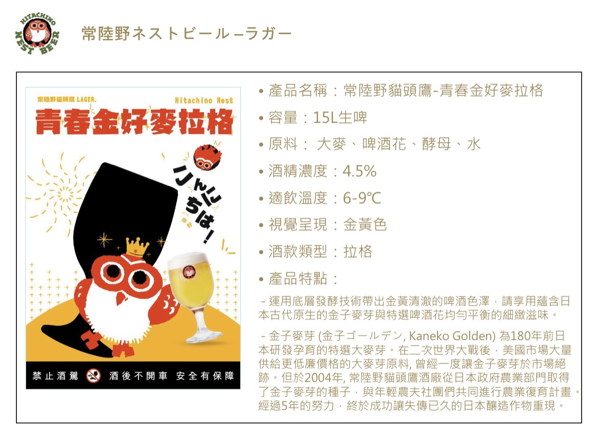 這款酒以拉格風格為基礎,展現乾淨、清爽、俐落又不失麥芽存在感的經典輪廓,也延續了常陸野貓頭鷹一貫重視原料與產地故事的品牌特色。
