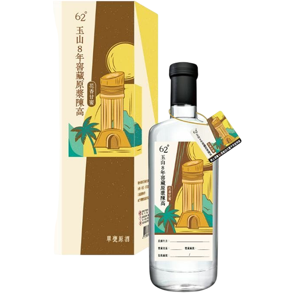 玉山8年 窖藏原漿陳高:花香甘蜜,嚴選優質高粱,經過八年窖藏,未經加水稀釋,保留原酒最純粹的風味,散發獨特花香與蜜香。酒標以粉黃色射日塔為主題,結合蒸餾年份、窖藏區與甕號,每瓶都是獨一無二的限量珍藏,代表著嘉義在地的獨特風情。