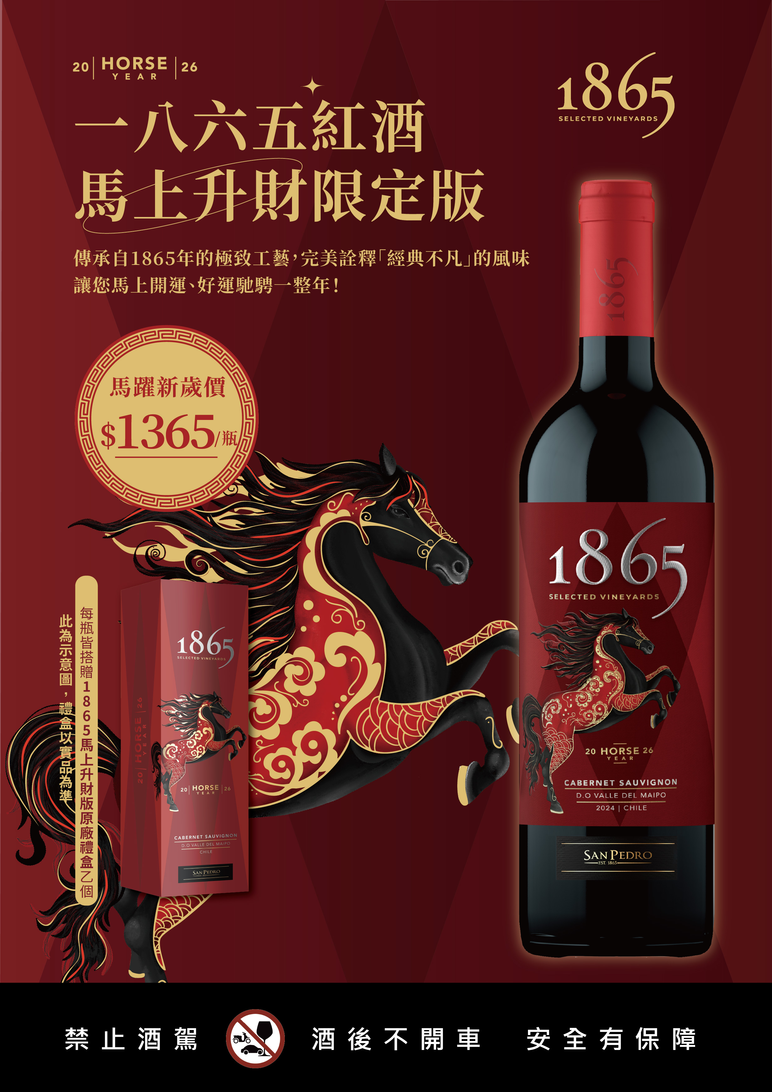 聖派德羅 1865馬年限定版 Vina San Pedro 1865 Horse Year Limited Edition 聖派德羅 1865 以酒廠創立年份「1865」命名,獨特酒質不僅摩登高雅,又相當前衛,真實地還原1865那年,最簡單的堅持,以其蘊含著超過150年的釀酒經驗,完美展現聖派德羅酒廠,對品質的堅持與對葡萄酒的熱情,同時鞏固了該品牌20多年來的使命—探索智利和阿根廷山谷中的地塊,使每個葡萄品種都能充分展現最佳狀態。