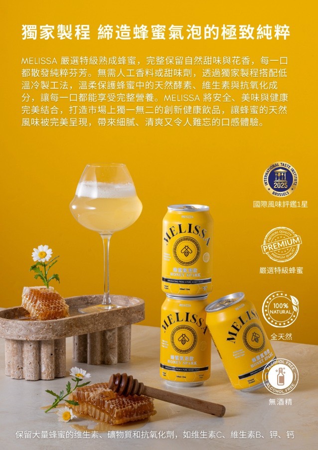 市面上多數蜂蜜飲偏向功能型或傳統沖泡型飲品,MELISSA 則將蜂蜜的天然風味,轉化為更符合現代餐桌、聚會、活動接待與禮贈需求的即飲型氣泡飲。它保留蜂蜜的親和度,同時透過更細膩的泡感與整體包裝調性,讓飲品從日常補充,升級成具有辨識度的品味選擇。